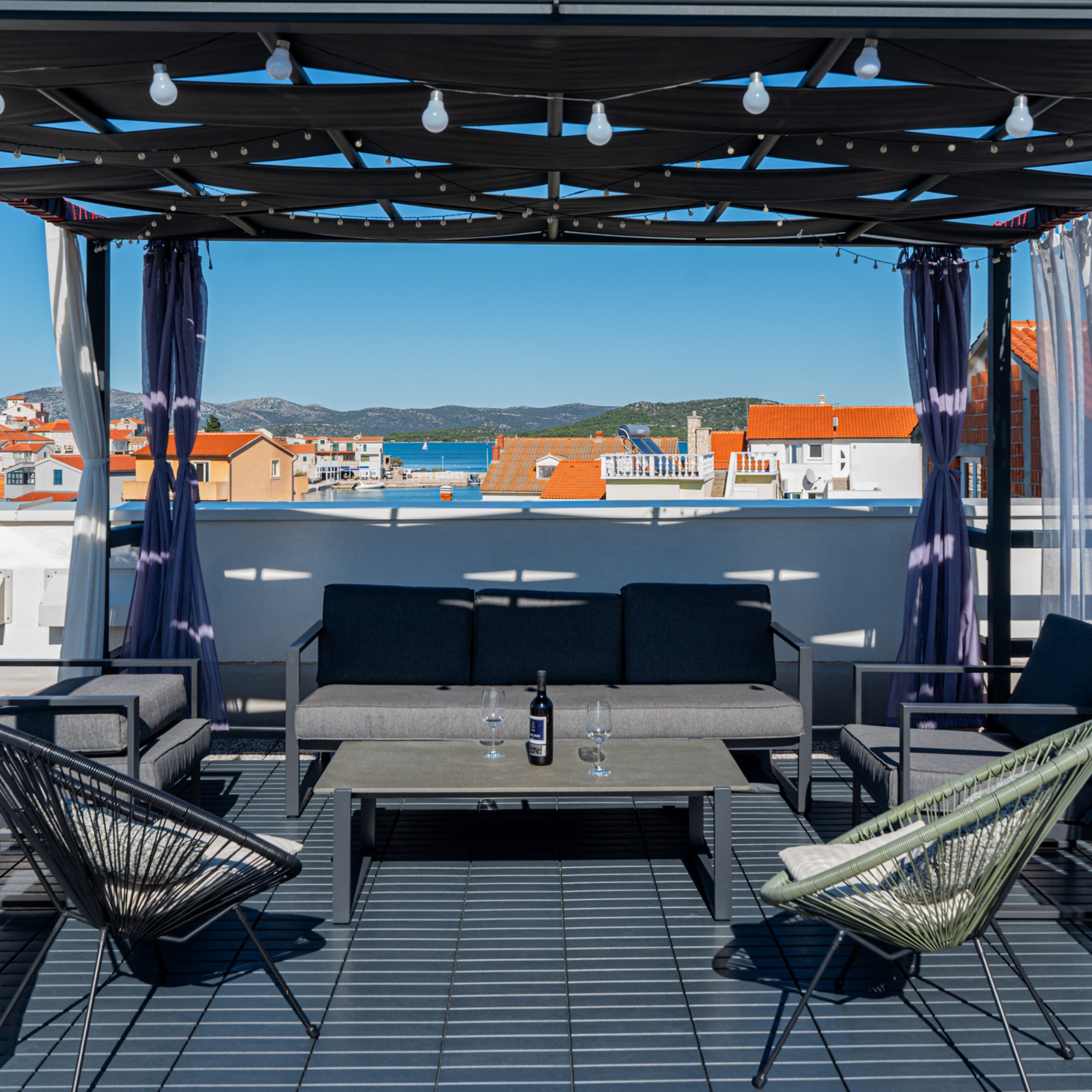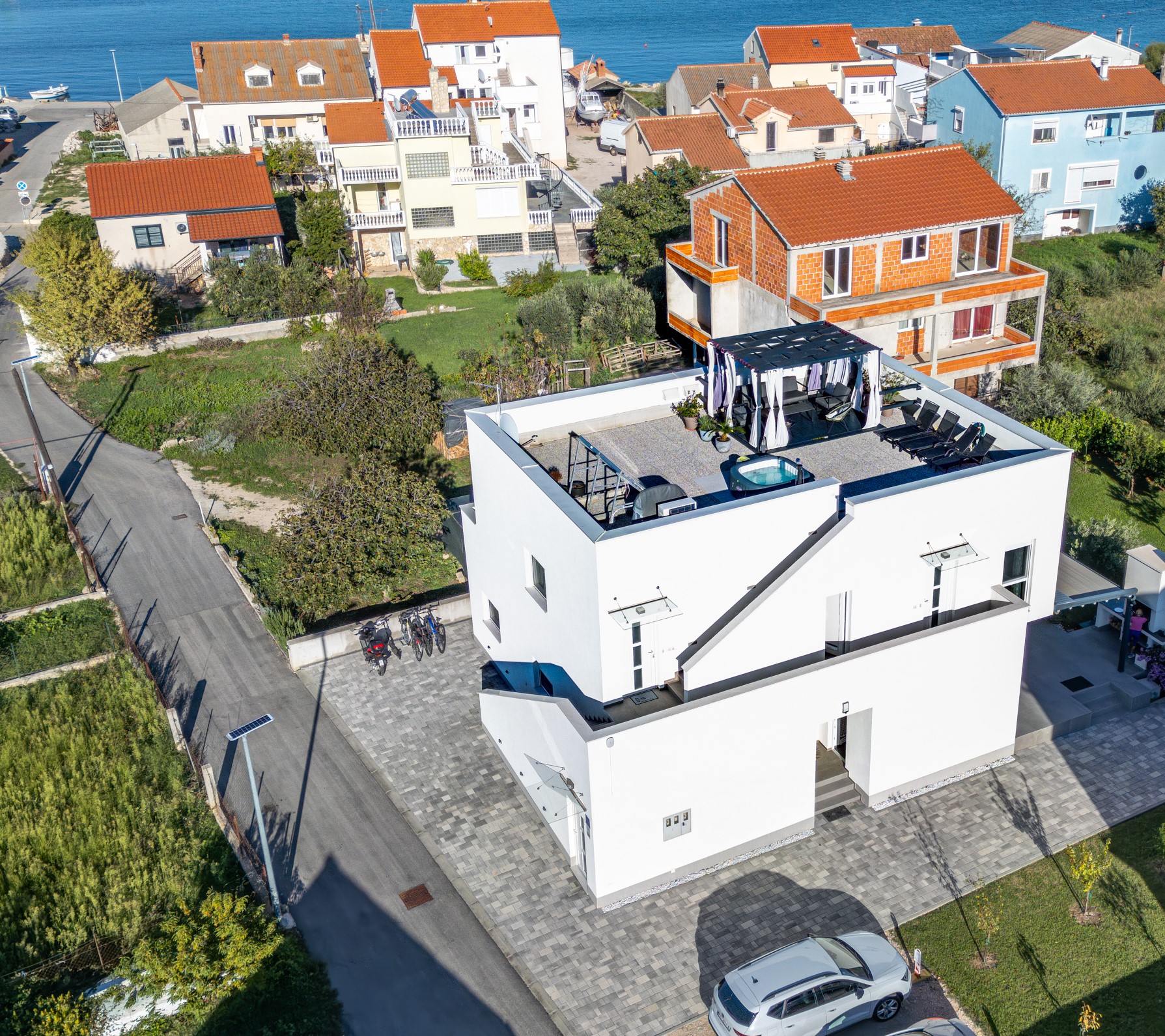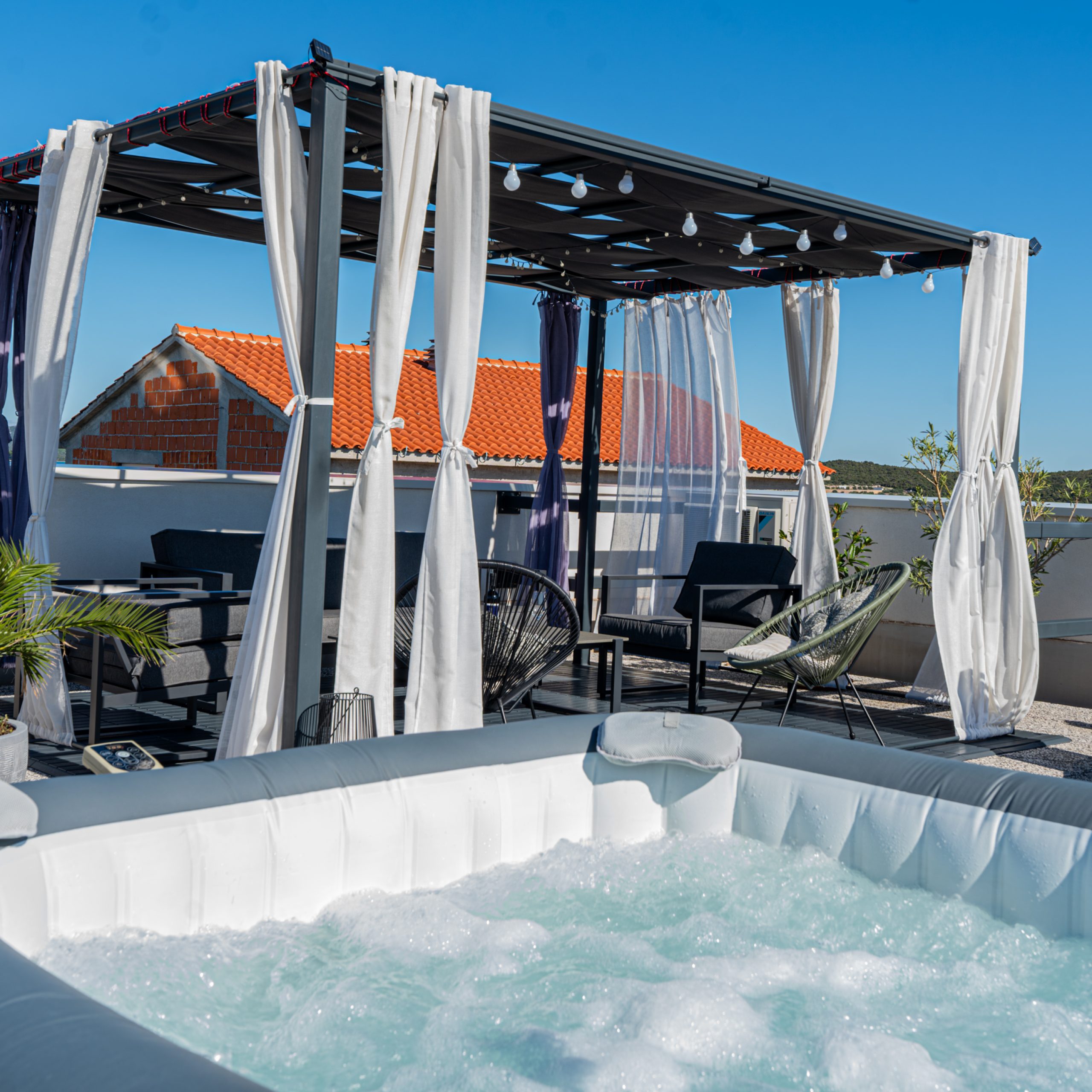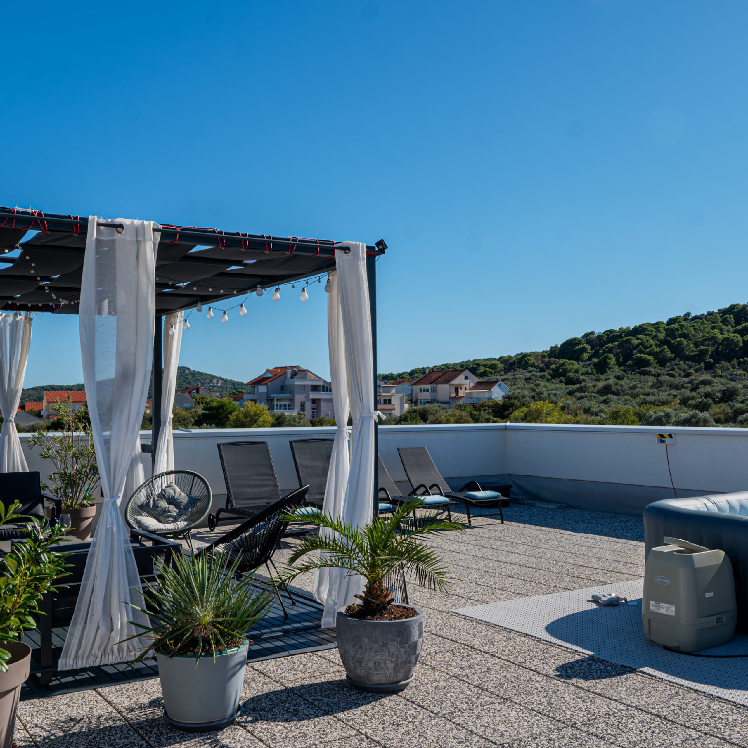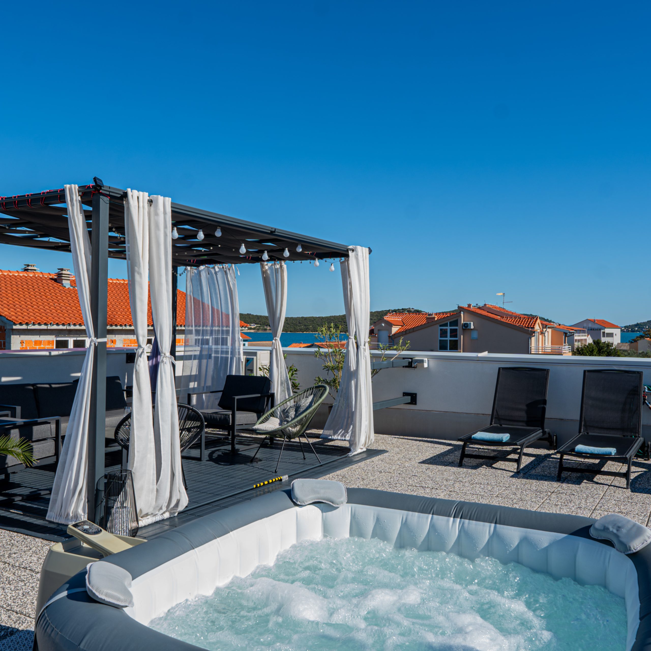 Na ravnom krovu kuće uređena je zajednička terasa sa tendom, sjedećom garniturom, ležaljkama i hidromasažnom kadom (jacuzzi).
