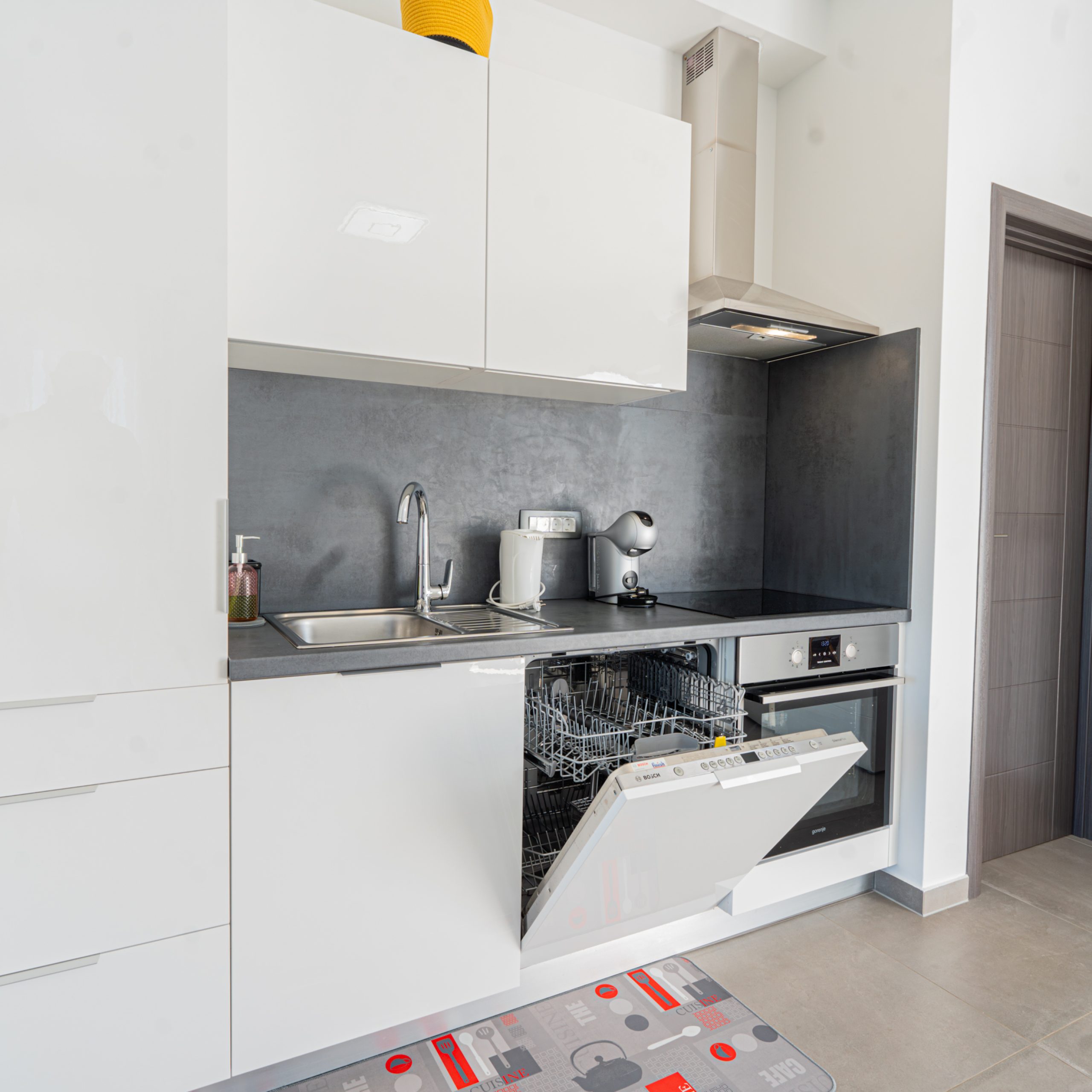 Kuhinja  sadrži stroj za pranje suđa, pećnicu i mikrovalnu, indukcijku ploču za kuhanje, napu, frižider sa zamrzivačem , aparat za kavu, električno kuhalo za vodu, električni gril, toster.