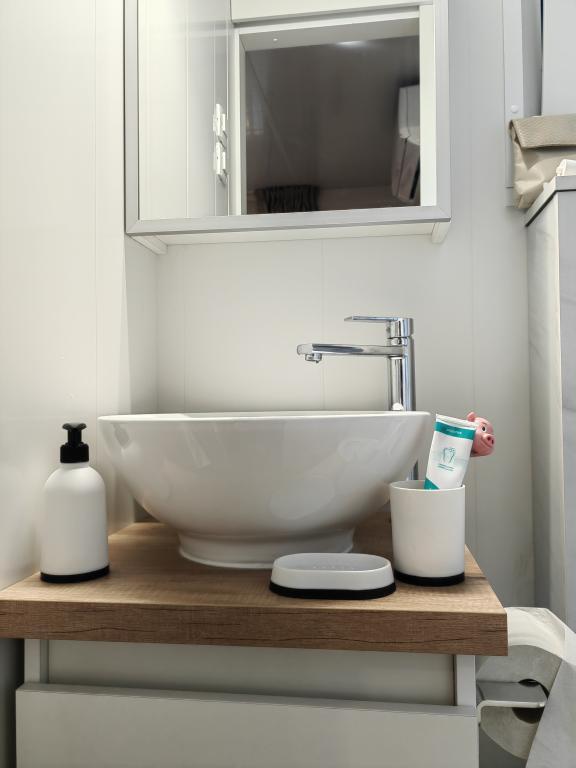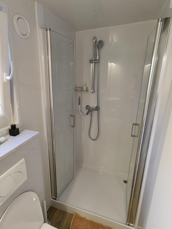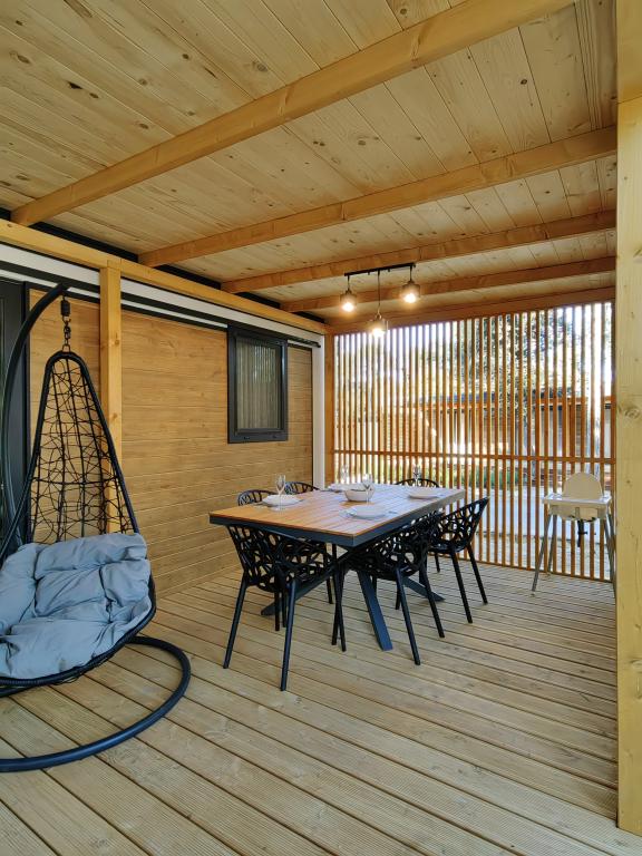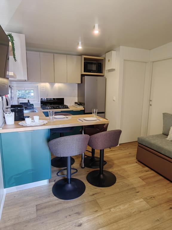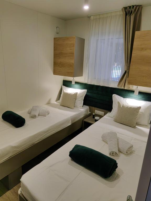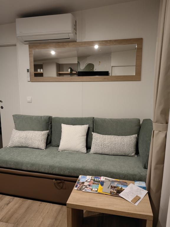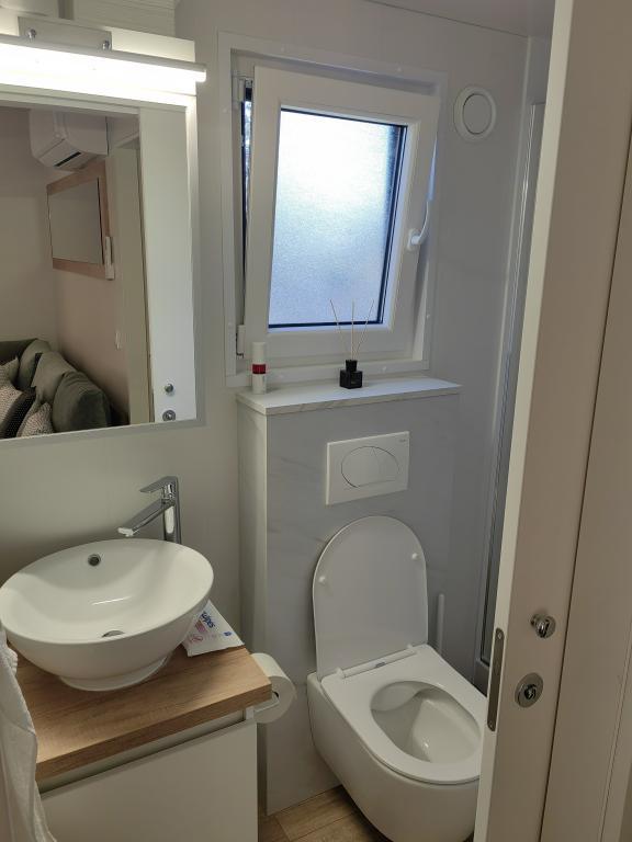 Uživajte u prekrasnom okruženju ovog romantičnog mjesta u prirodi. Potpuno opremljena mobilna kućica “Tonka” je potpuno nova (2024.), moderno opremljena, mobilna kućica Kapacitet: 4+2 32 m2 1 spavaća soba s bračnim krevetom 1 spavaća soba s dva odvojena kreveta 2 kupaonice kuhinja i dnevni boravak s kaučem s funkcijom ležaja (2 osobe) natkrivena terasa sa blagavaonskim stolom (6 osoba) lounge zona Potpuno opremljena: – klima uređaj – plinski štednjak – hladnjak s odjeljkom za zamrzavanje – mikrovalna pećnica – aparat za kavu – kuhalo za vodu – TV – besplatni WiFi – sušilo za kosu – ručnici i posteljina – roštilj na plin – parkirno mjesto